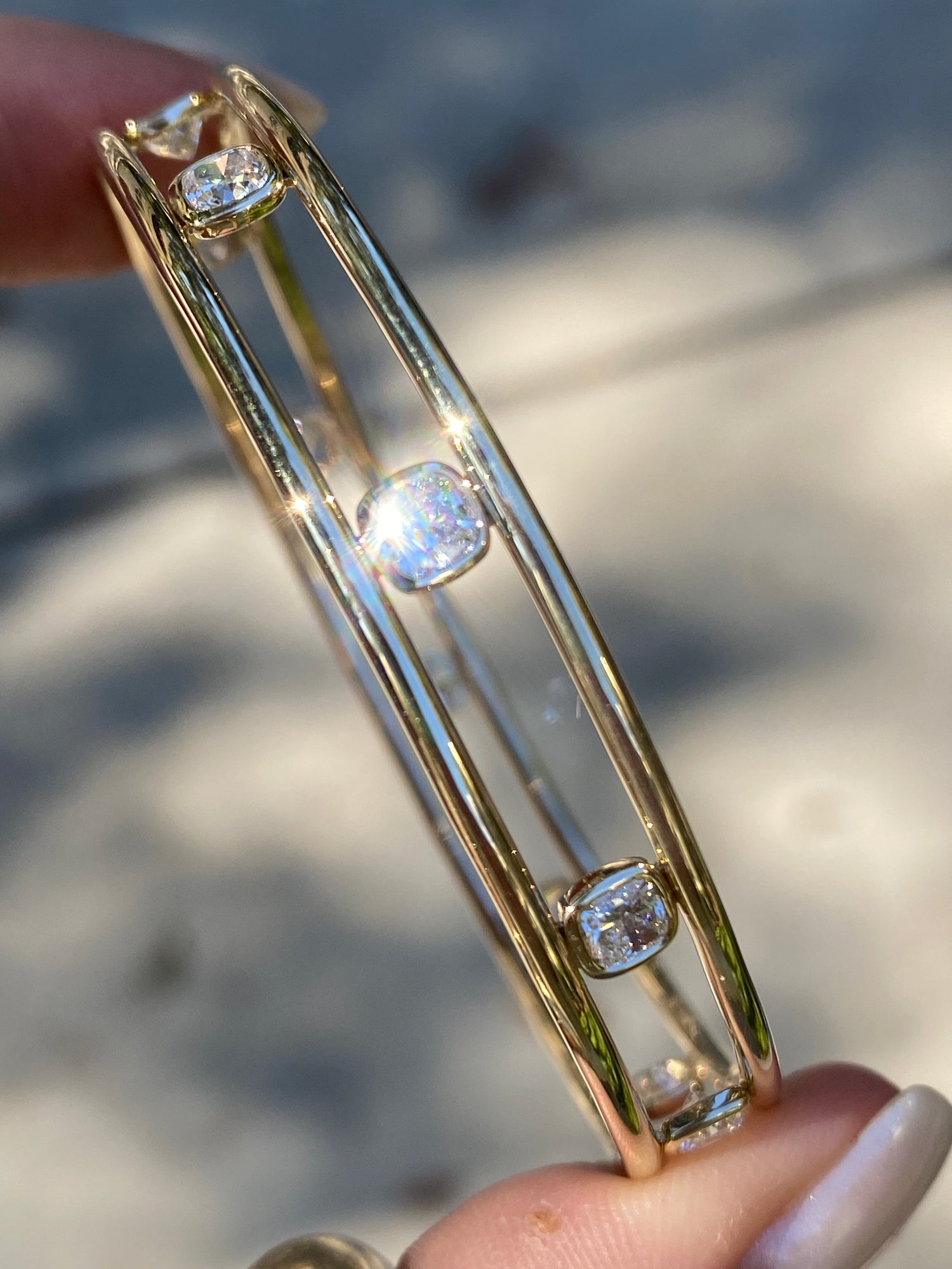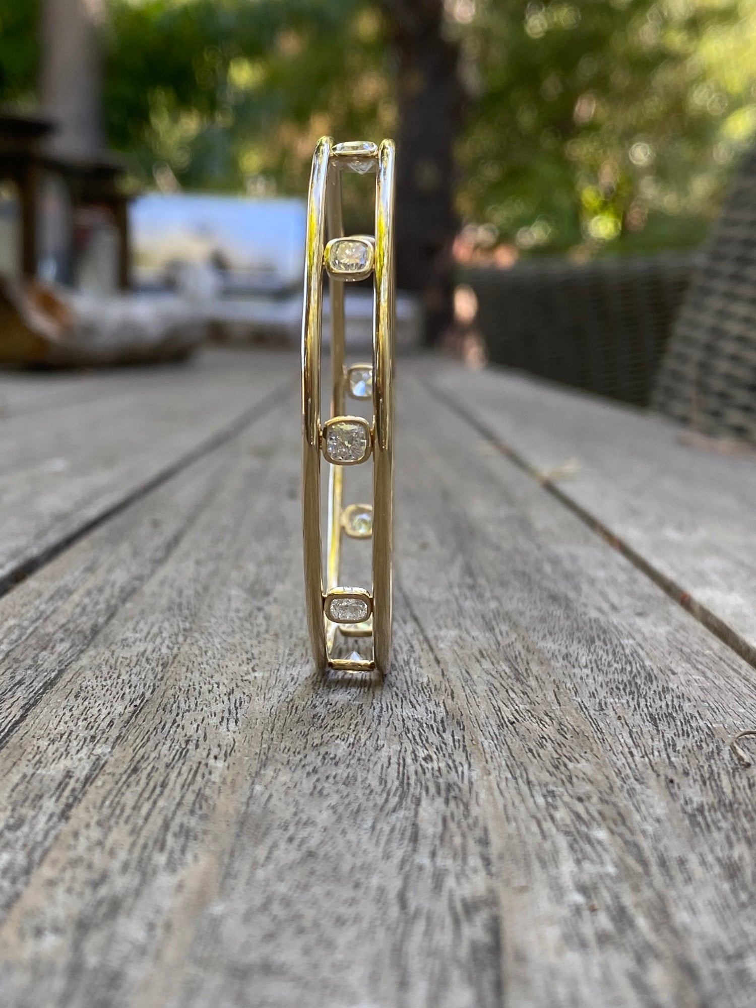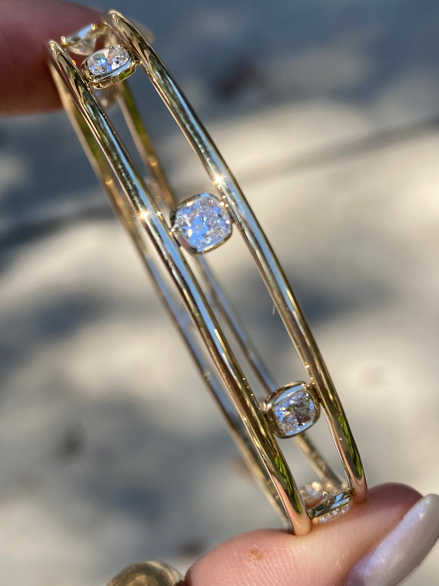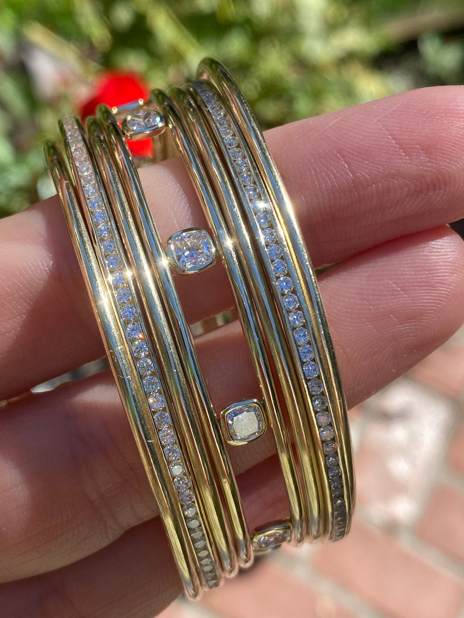 The Luxe Legend Snazzy Bangle is made with 2.5 carats of DE color VS1-2 lab grown diamonds (mined diamonds can be used upon request). I use 10, big juicy 1/4 carat cushion cut diamonds. beautifully set in 14 carat gold bezels.