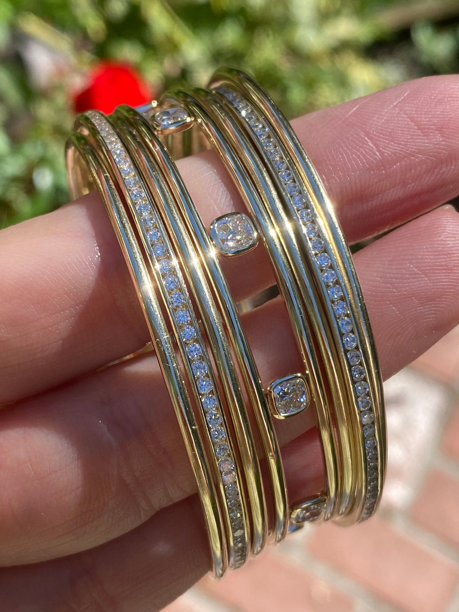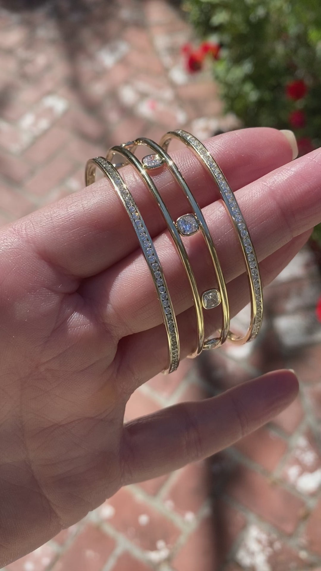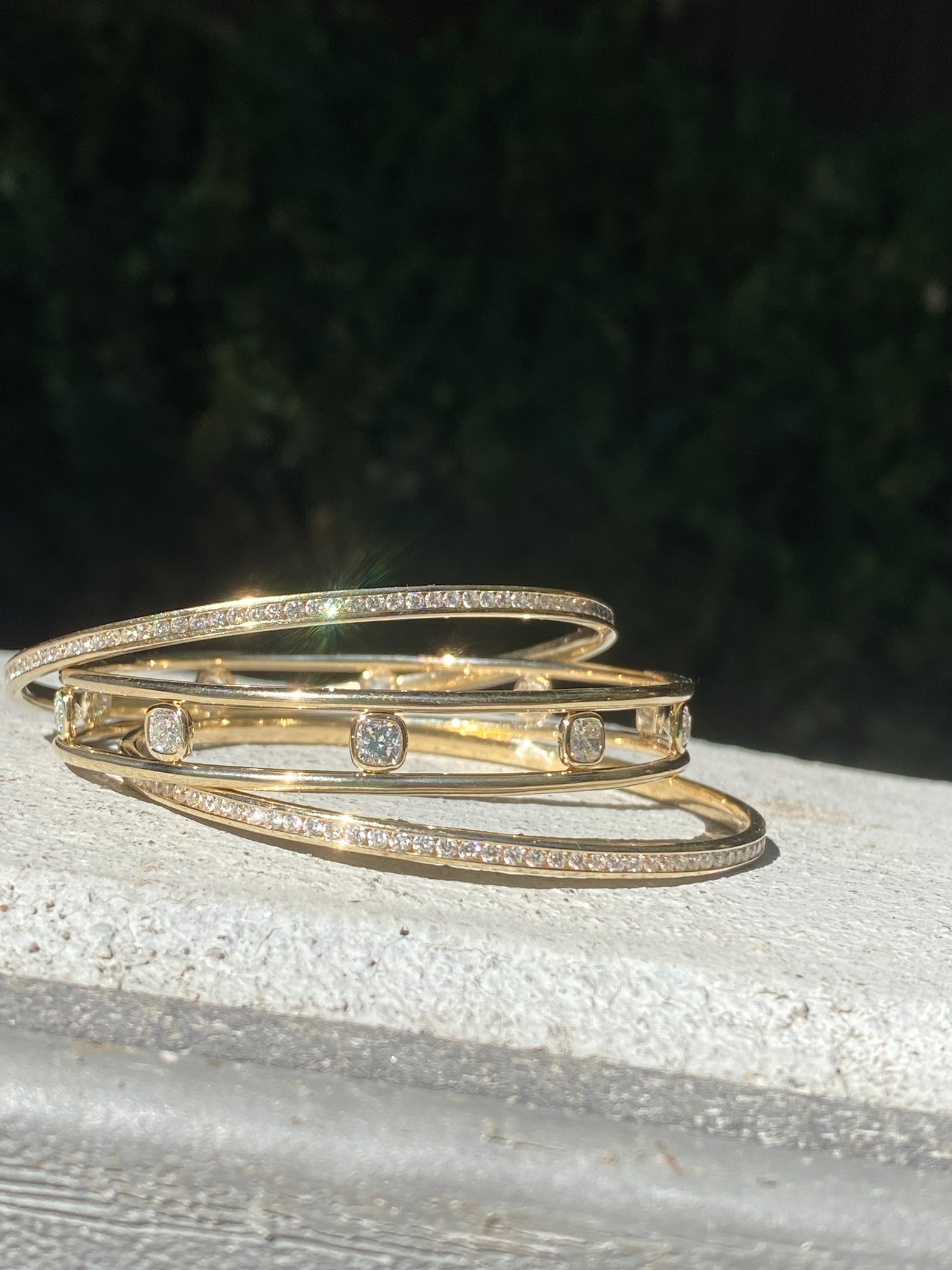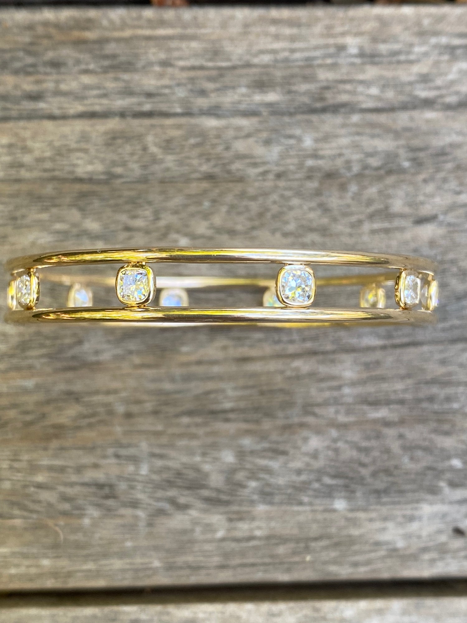 The Luxe Legend Snazzy Bangle is made with 2.5 carats of DE color VS1-2 lab grown diamonds (mined diamonds can be used upon request). I use 10, big juicy 1/4 carat cushion cut diamonds. beautifully set in 14 carat gold bezels.