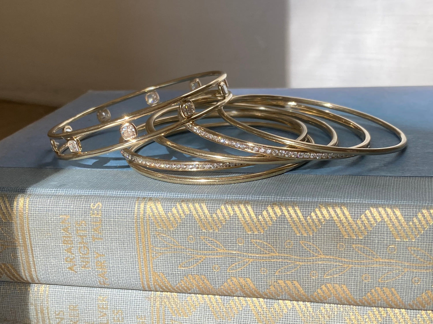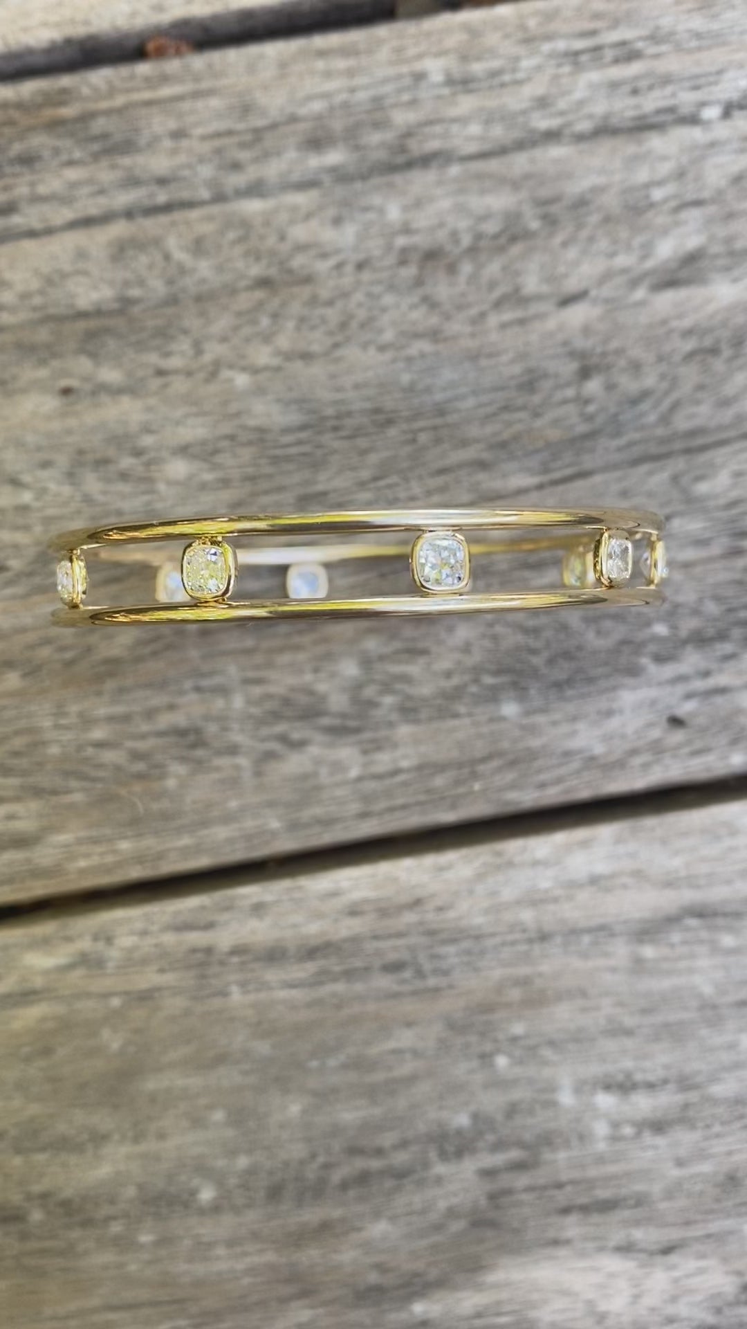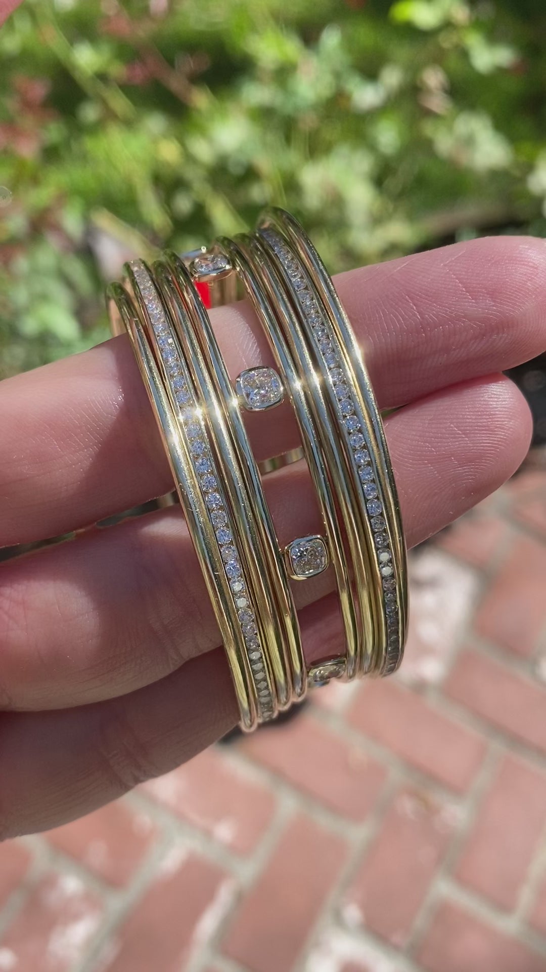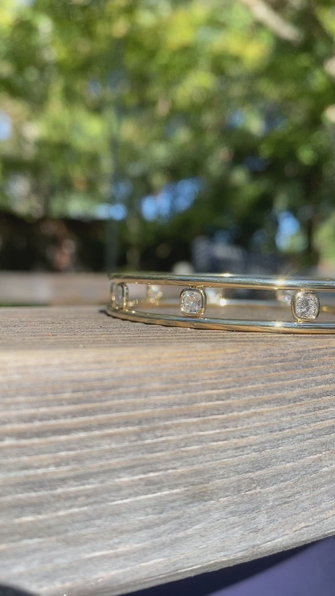 The Luxe Legend Snazzy Bangle is made with 2.5 carats of DE color VS1-2 lab grown diamonds (mined diamonds can be used upon request). I use 10, big juicy 1/4 carat cushion cut diamonds. beautifully set in 14 carat gold bezels.